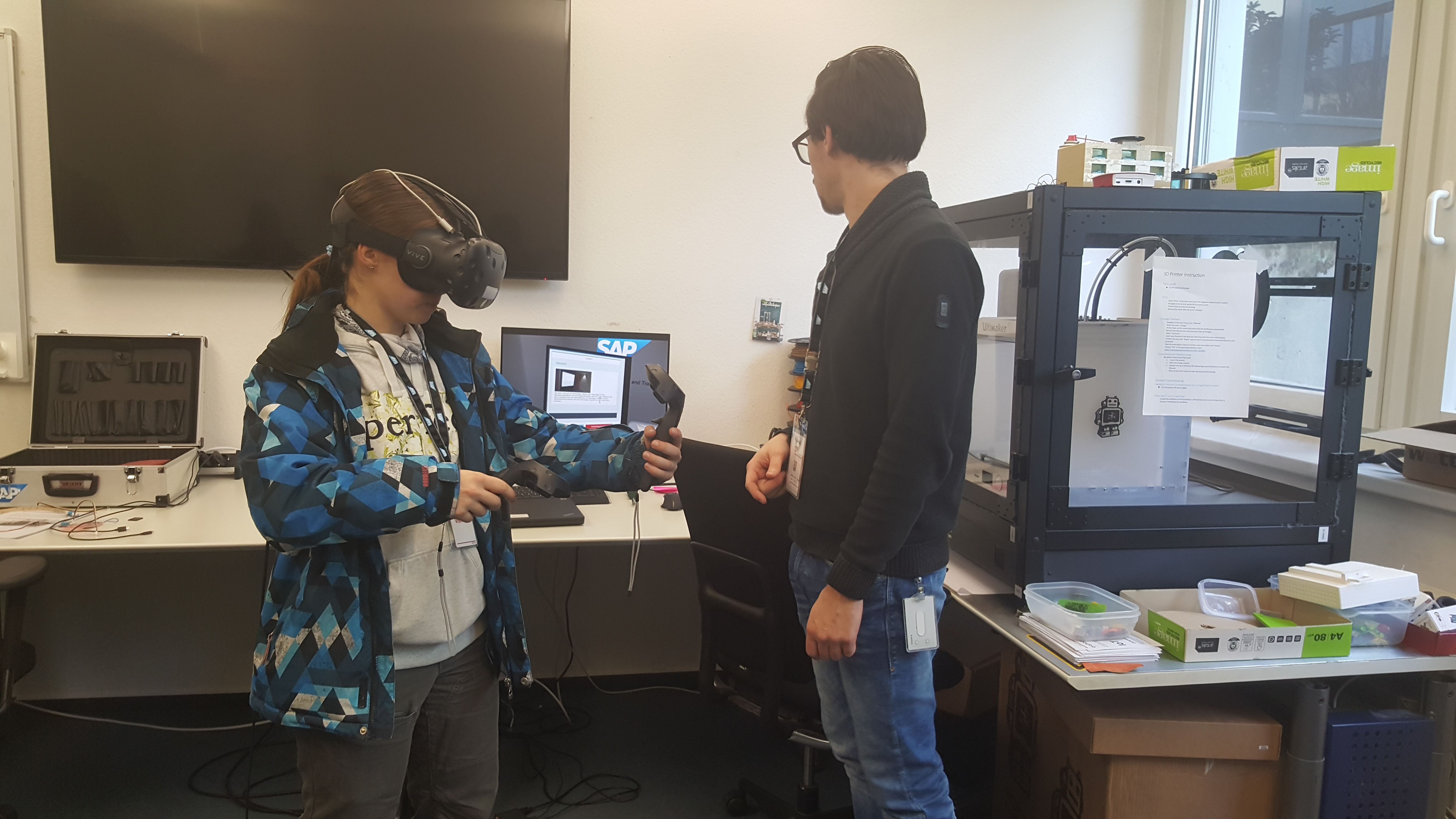 Im zweiten Teil des Workshops folgte zunächst ein lockerer Rundgang durch die großen SAP Gebäude, hin zum SAP d-shop. Im d-shop, eine Abkürzung für „developers‘ workshop“, hatten die Teams die Möglichkeit, spielerisch in die virtuelle Welt einzutauchen. Mit der HTC Vive, einer „virtual-reality“-Brille durften Freiwillige das Prinzip der Lagerung von Paketen und deren Transport nachvollziehen. Im Anschluss wurde der für alle bekannte 3D-Drucker vorgestellt und dessen Ablauf erklärt. Das Highlight des d-shops zeigte sich am Ende unserer Besichtigung: Die „Augmented reality“ – Brille, mit welcher man die Möglichkeit hat in eine erweiterte Realität einzutauchen. Unabhängig davon, welche virtuellen Gegenstände man aussuchte, ob Hund, Ballerina oder Astronaut, faszinierte die schnelle Vermessung und Darstellung der Brille im echten Raum.
